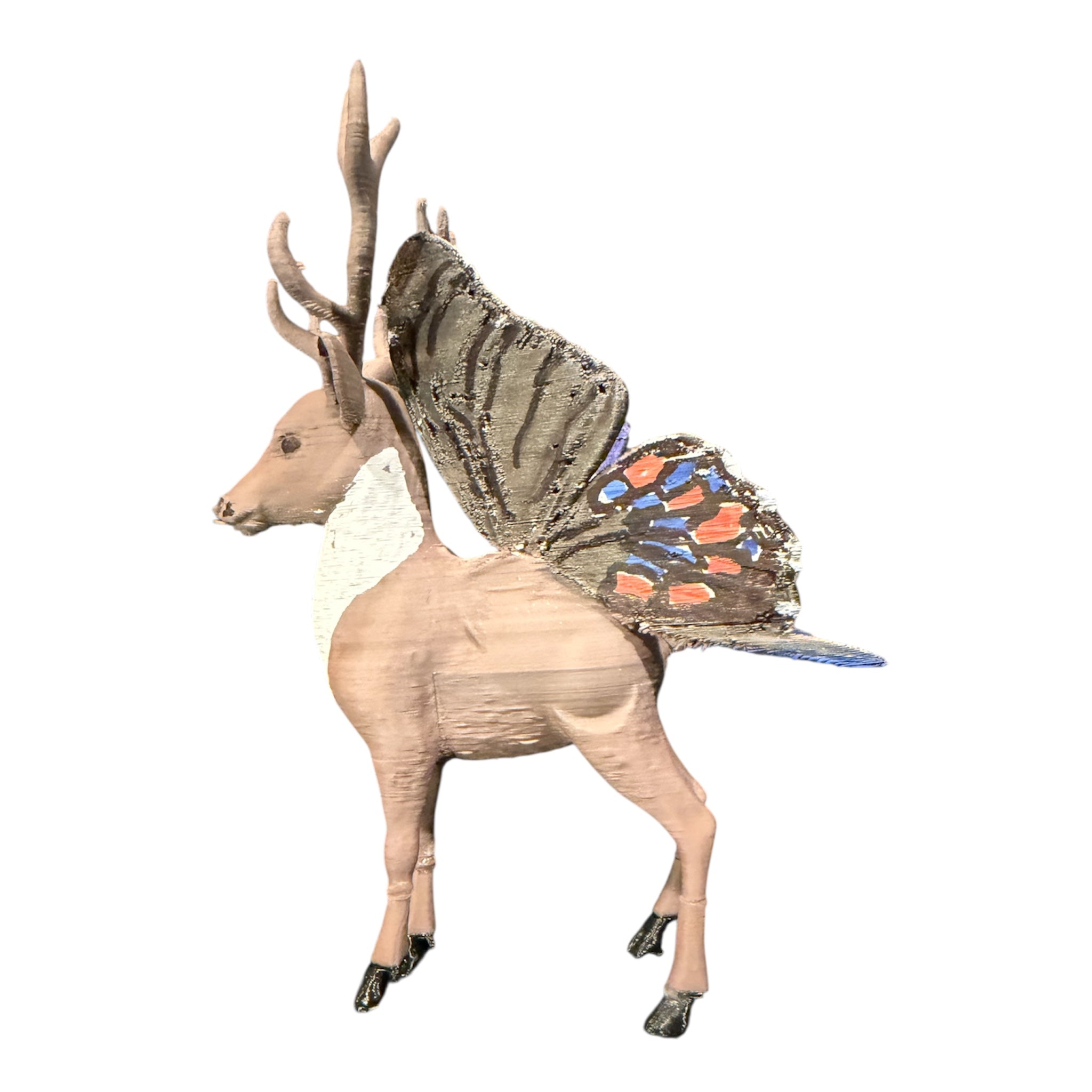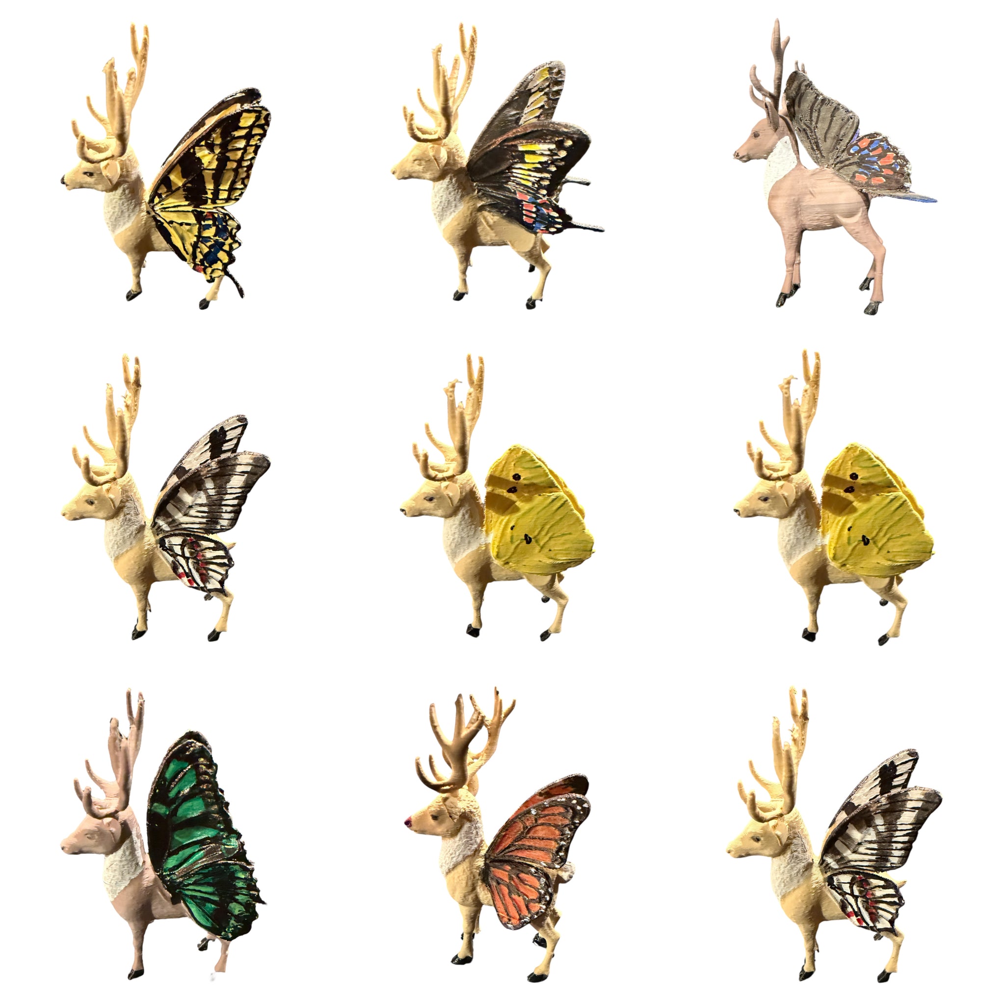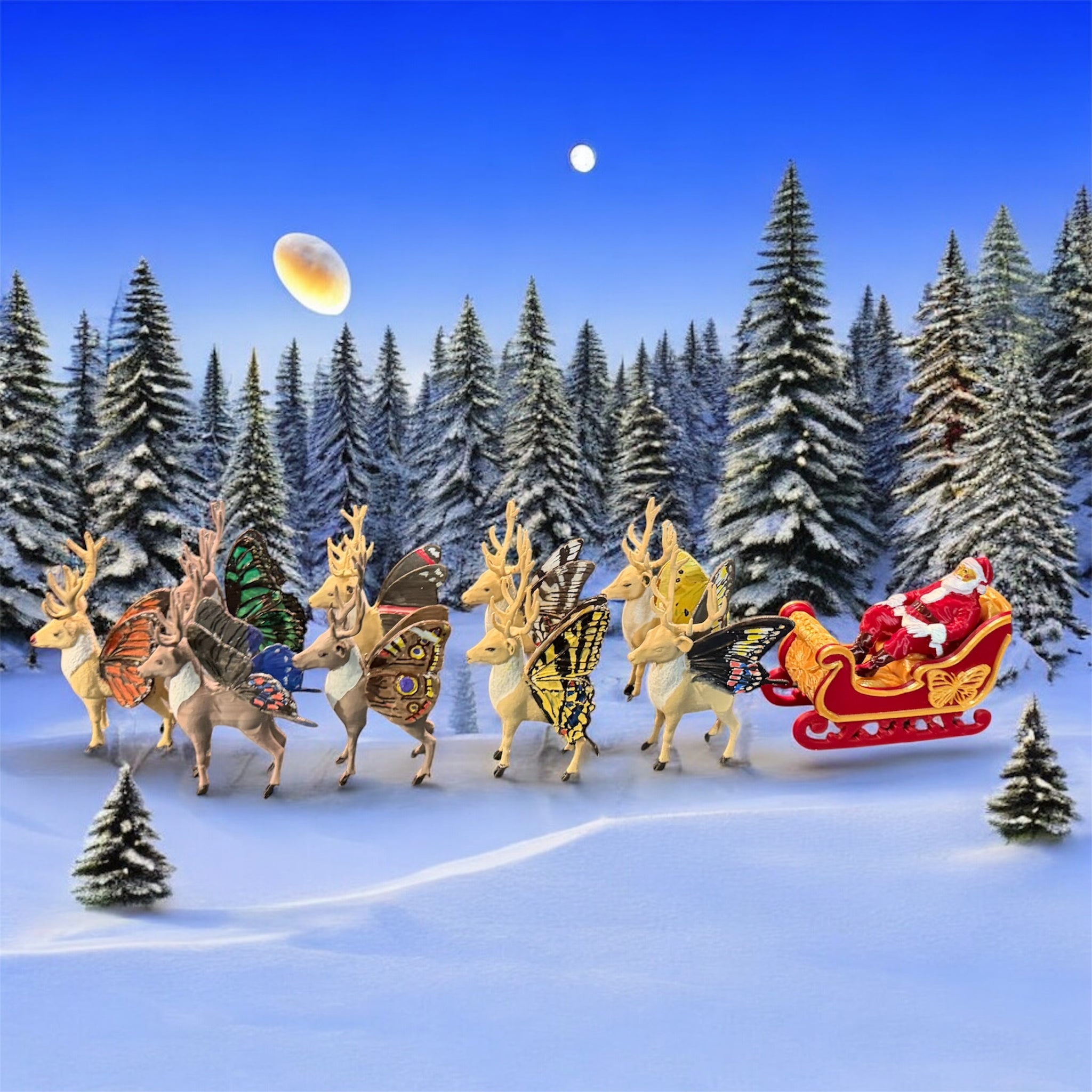 Hand painted 3D PLA plastic printed Santa and Reindeer. Beautiful Butterfly inspired Christmas Display featuring Reindeer with some of our favorite Butterfly wings.